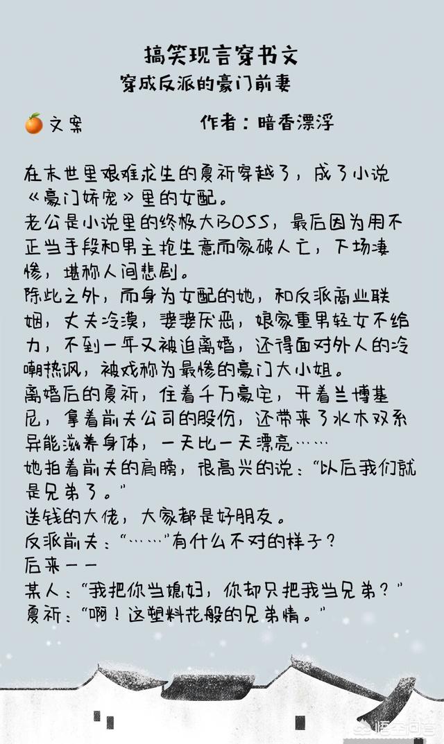 《穿成反派的豪门前妻》。女主穿到一本书里的反派女配。和男配的故事。脑回路清奇。特搞笑。