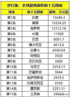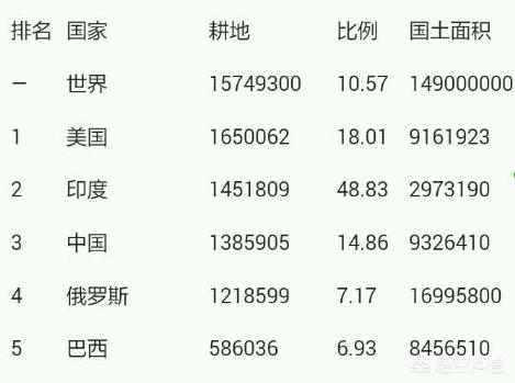 其实。印度也是一个农业大国。虽然它的陆地面积不到中国的1/3。但耕地面积比我们国家还大。中国陆地面积虽然大。但西北大部分地区是隔壁沙漠。而青藏高原海拔高。都不适宜耕种。从耕地面积来看。目前印度的耕地面积高达156.46万平方千米。位居世界第一。而中国耕地面积为119万平方公里。位居世界第四。