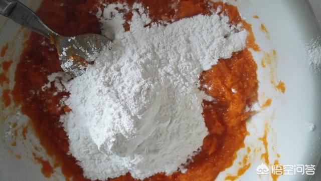 蒸熟的南瓜用勺子压成泥。加入糯米粉