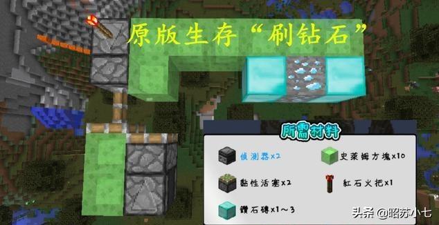 活塞、粘液块实际上是Minecraft最为神奇的方块。是他们改变了Minecraft的方块。各类自动门。自动电梯全都有他们的身影。而图片中的装置。也是“刷钻石”方块最简便的方法。这是没开作弊的原版生存。此方法已在最新版的1.13中测试。可以说是《我的世界》全版本通吃的“刷钻石”方法了。