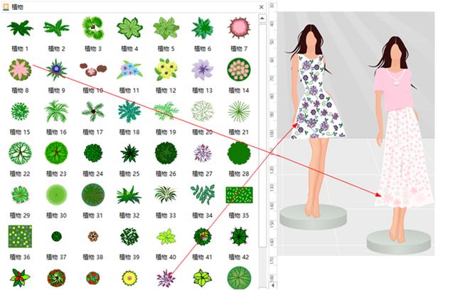您也可以使用其他库。使你的衣服更加漂亮。例如。点击符号选项卡。单击预定义库。选择平面布置图。然后选择植物。将花的形状拖到衣服。