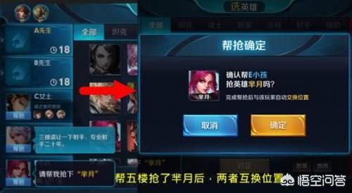 上图就是最典型的帮抢。五楼发出邀请。需要一楼帮抢芈月。一楼点击确定后。就和五楼互换位置了。五楼出现在一楼直接抢芈月。原来的一楼调换位置去到五楼。这样。就有效的避免了题主说的。互换英雄时候出现的尴尬情况。