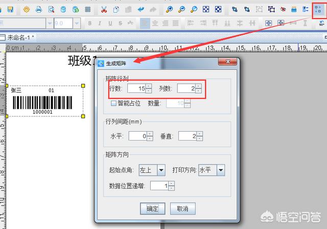 2、选中“群组”后的对象。点击“生成矩阵”。根据学生人数及标签纸尺寸。行数15。列数2。垂直间距为2。即可看到当页所有学生考试条码的信息。
