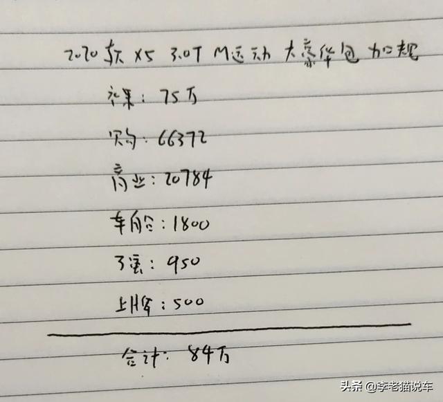 价格方面。2020款宝马x5 3.0tm运动大豪华包。裸车报价在75万左右。全部落地再加购置税66372。车船税1800。强险950。商业险20784。上牌500。共合计84万左右。