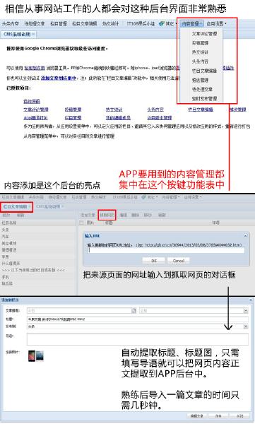 快速的内容抓取。让后台采编人员的数量可以降到最低。维持一个日更新量在100篇文章左右的APP客户端。一个工作人员足矣。