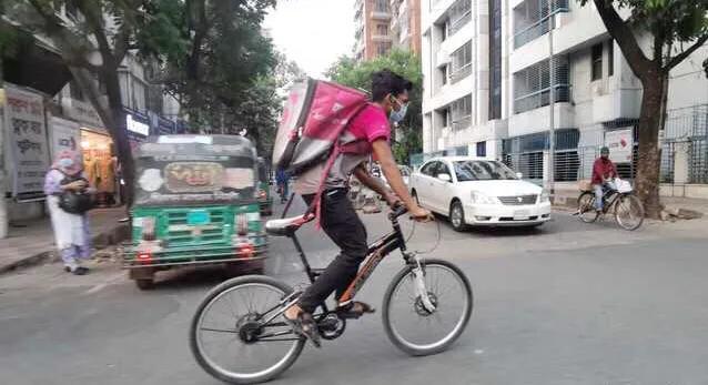 孟加拉的外卖小哥是穿粉红色衣服的。他们以骑自行车为主。