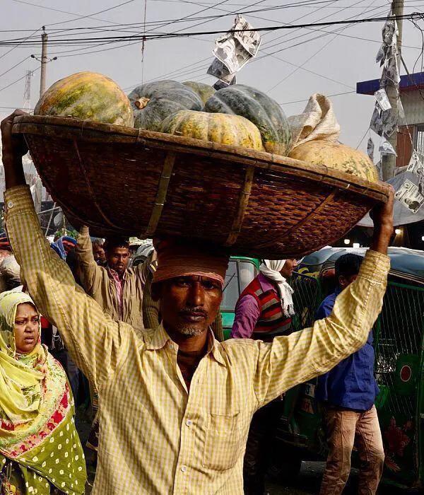 孟加拉人无论男女老少。有一个特别的才能。就是能用头顶运东西。而且承重相当厉害。孟加拉的搬运工都是靠头顶来工作。能顶的就不会用手提或者用肩挑。
