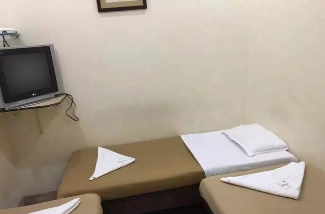 他领我到房间后。我更加傻眼了。怎么跟我自己订的房间不一样。我订的是“超级豪华VIP客房”。300元一晚。网上那个房间图片看着很高大上。而服务员带我来的房间有很大的霉味。里面摆着三张小床。还有个大头电视机。再加一个小电扇。