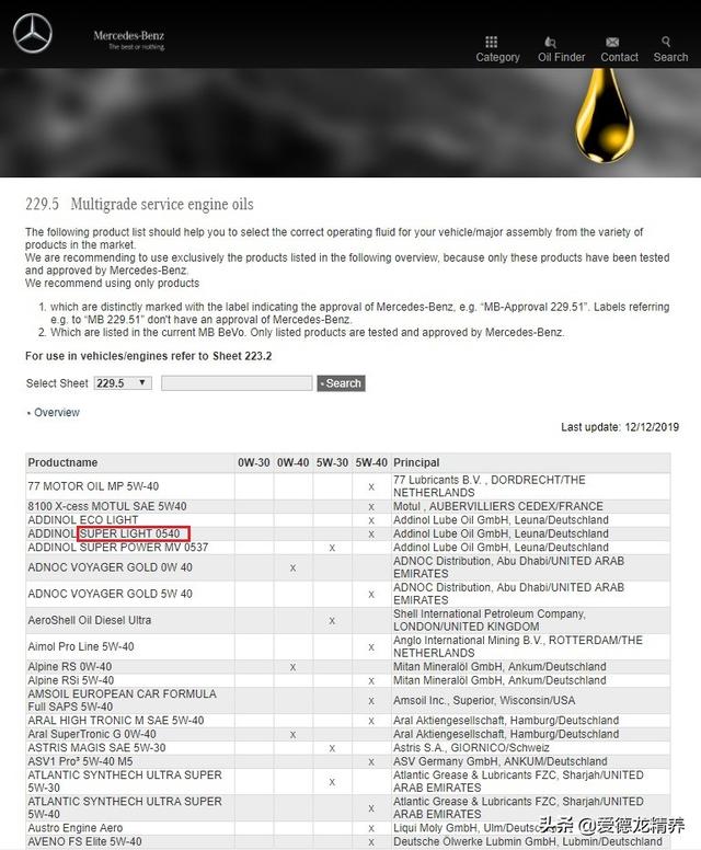 奔驰官方网站公布车用工作液通过奔驰认证的认证标准、产品型号、制造商、粘度等级