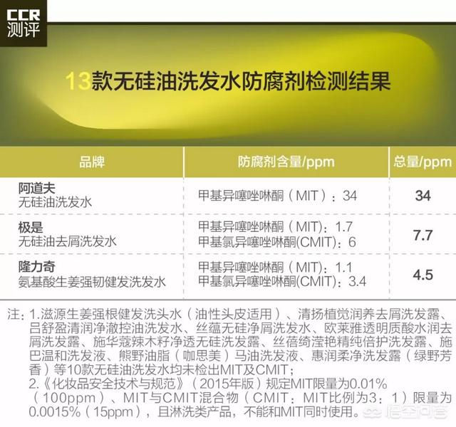 根据检测结果。3款检出MIT/CMIT防腐剂的无硅油洗发水中。除阿道夫无硅油洗发水。极是、隆力奇同时检出CMIT和MIT。总量分别为7.7、4.5ppm。且CMIT:MIT含量之比大致为3:1。因此可能添加的是防腐剂“卡松”。不过总量均未超过《规范》要求的15ppm。