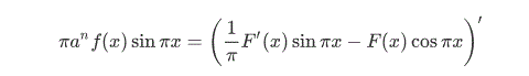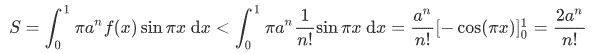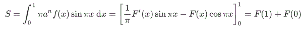 另一方面。由于 a, f(x) > 0 。而 在 区间 (0, 1) 内 sin πx > 0。 所以 πaⁿf(x)sin πx 在 区间 (0, 1) 是正的。故 积分 S > 0。