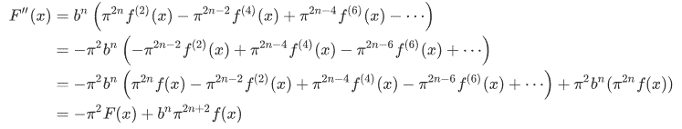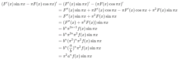 假设 π² 是有理数。则 π² = a/b, 其中 a, b 均为 正整数。利用 f(x) 偶数阶导数。定义另外一个多项式: