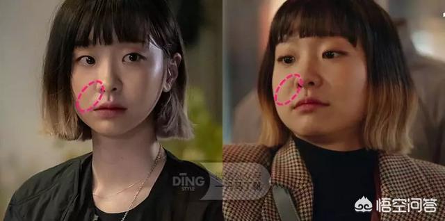 之前我们说过。齐刘海发型减少了留白。会让视觉中心从眼睛下移到鼻子。剧中金多美留了齐刘海。就把鼻子这个bug放大了。变得很显眼。