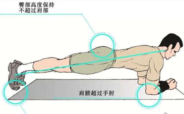 b.翘臀:臀部超过水平线用提高的方式对腰部施压。以此延长平板支撑的时间。
