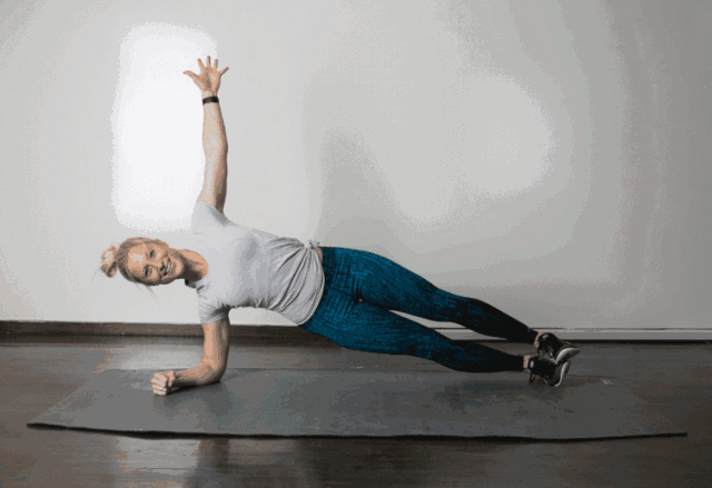 腹部发力保持左右倾侧。肩关节不高耸。同样平板支撑姿势。左手手肘离地需要身体保持水平垂直向一侧倾斜。肩关节保持下沉放松姿势。手肘支撑时防止耸肩。