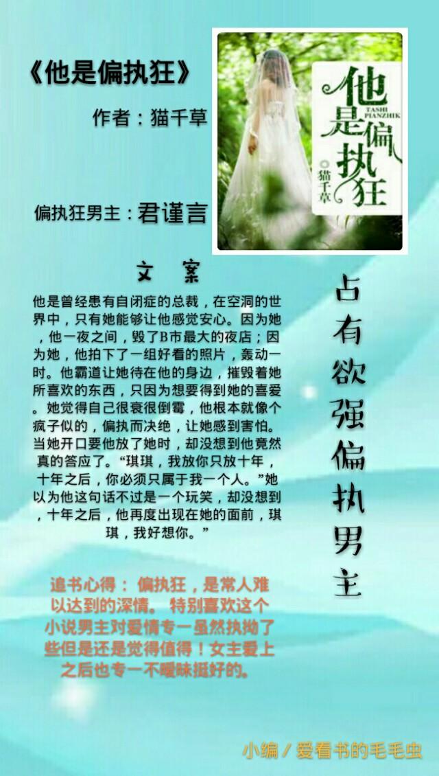 刚好今天收集了五本。男主是偏执狂。病娇。占有欲强。没女主不行。爱到骨子里的小说。喜欢的快抱走了~