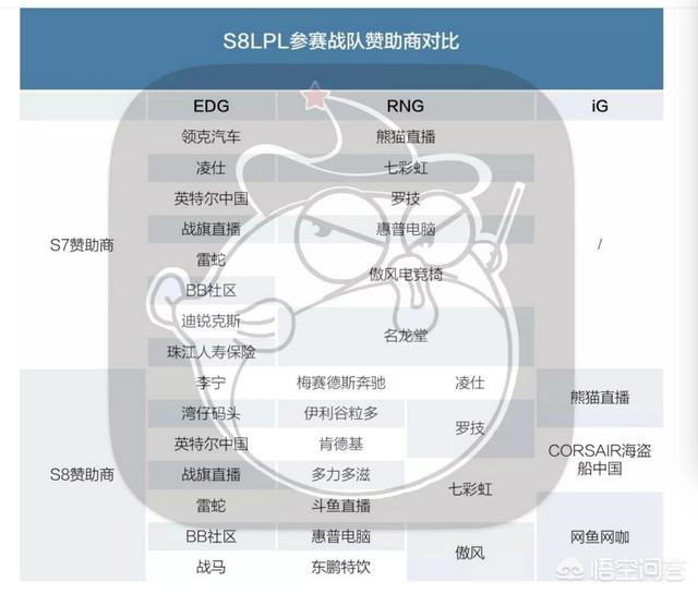 说起RNG的赞助商。我这里有一张近两年的所有赞助商列表图(图一)。整整17家!如果你不知道这是什么概念。那我告诉你iG两年只有三家:熊猫直播 网鱼网咖 美商海盗船。
