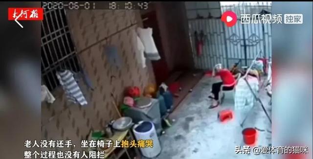 小男孩“大获全胜”以后顺利撤退。而老太太浑身伤痕累累。只能坐下抱头哀嚎。整个过程都无人干涉。