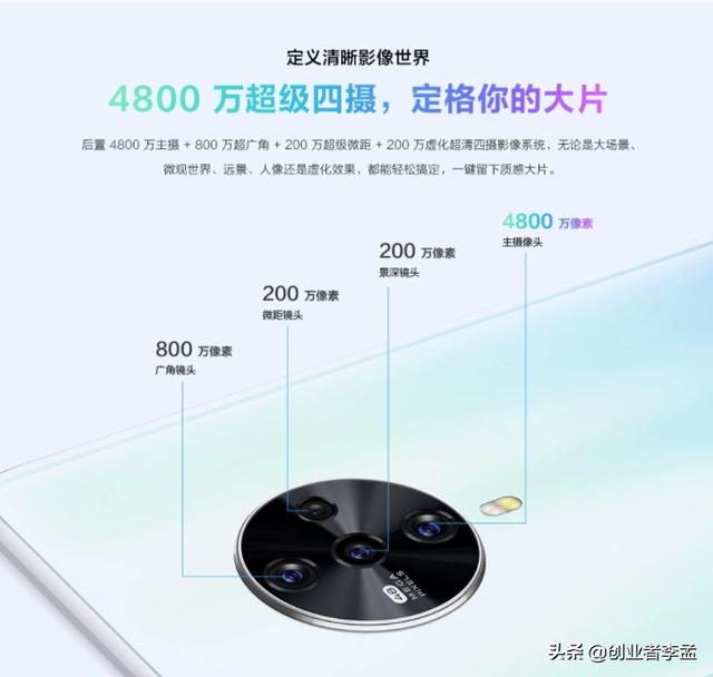 4800万像素超清主摄+800万像素超广角镜头+200万像素微距摄像头+200万像素虚化摄像头;前置则是3200万。从像素的整体来看。vivo S6缺乏主流的变焦镜头。这个是第一个方面而主打微距的基本上都是比变焦的便宜点。第二方面不得不承认。在3200万的主摄上比今年的很多2000元档的手机要好很多!