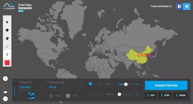 Amcharts是一个可以让你生成自定义地图的大利器。网站里涵盖了世界地图及各种国家地图。你不仅可以在地图上进行自定义配色、标注。还能选择不同的投影模式、尺寸等。