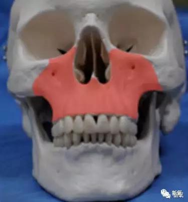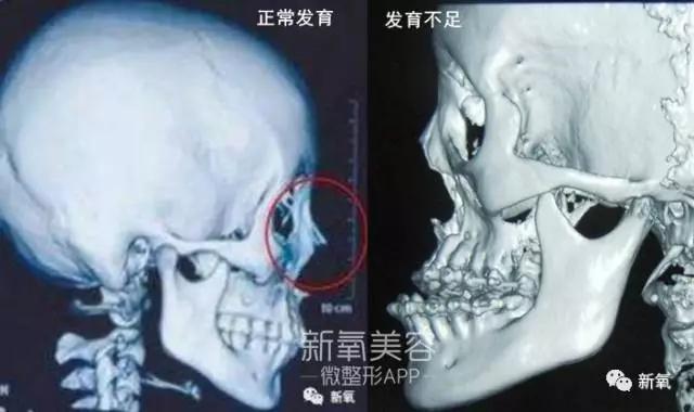 这种脸型形成的原因主要是上颌一直到眶骨位置的骨体发育不足。(红色部分)