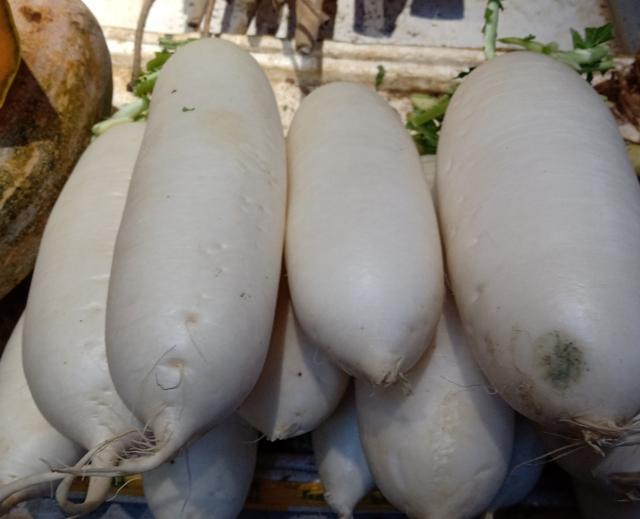 一条大萝卜。滚刀切成大块。放上七到八颗江瑶柱。加上一块瘦肉。放上清水。煲上一个小時。加盐或者鱼露调味就可以了。