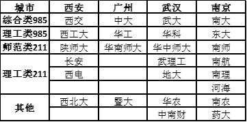 结合来看。985和师范类211方面南京、武汉一档。西安、广州第二档;理工类211南京第一。西安第二。武汉第三。广州第四;其他的南京武汉一档。广州第三。西安第四。