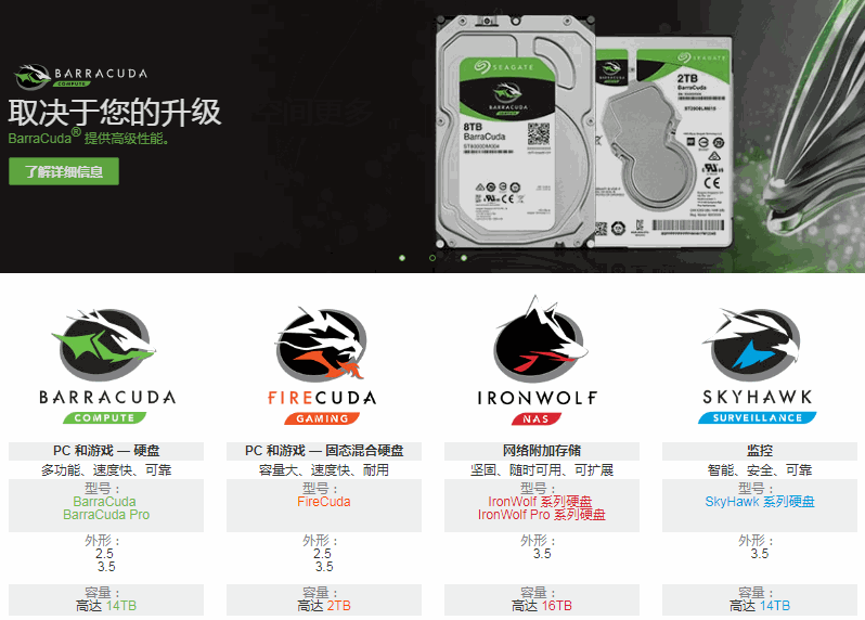 希捷产品线有主流桌面级BarraCuda酷鱼硬盘。游戏级FireCuda固态混合硬盘。监控级Skyhawk酷鹰硬盘。IronWolf NAS 硬盘。