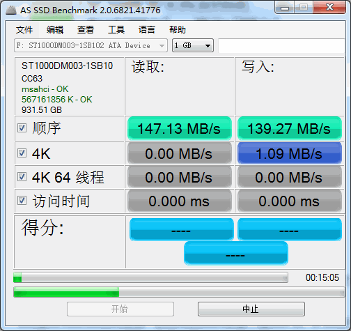 以上CrystalDiskmark测试数据可见。希捷还是比西数稍快那么一丢丢。如果用AS SSD Benchmark测试。到4K读写显示耗时15分钟以上。那也基本可以判定是SMR硬盘(如下图。奇客这块就是了。这样测试根本没耐心跑完)。话说回来。如果用上固态硬盘。机械硬盘到TB以上容量。读写速度反而是次要的了。可靠性才是最重要的。