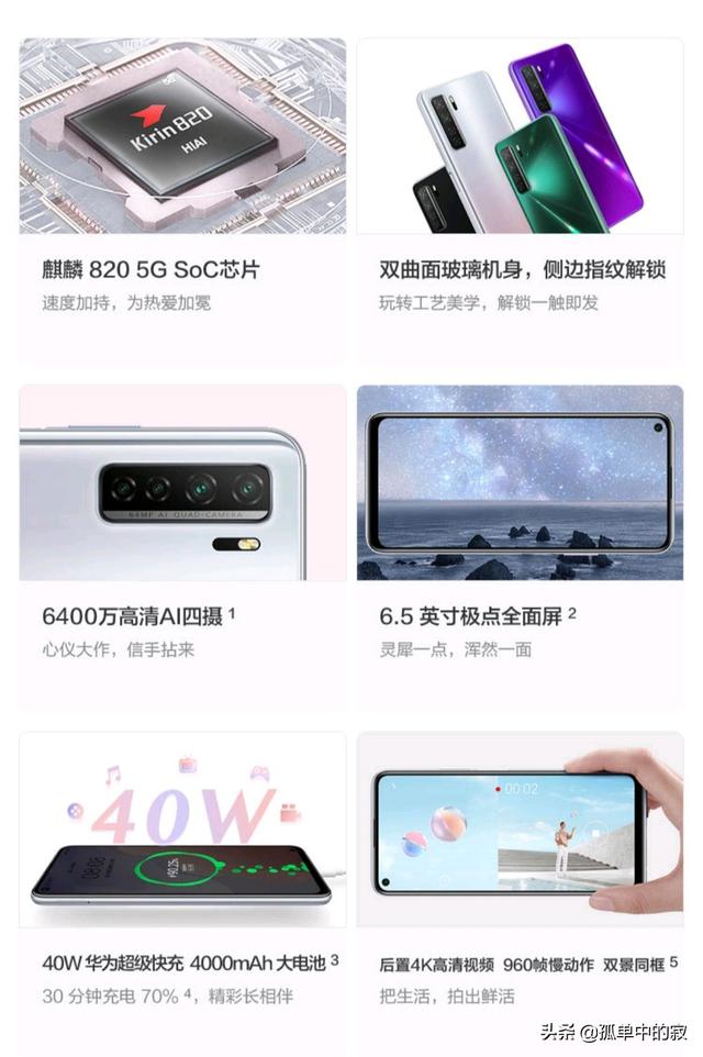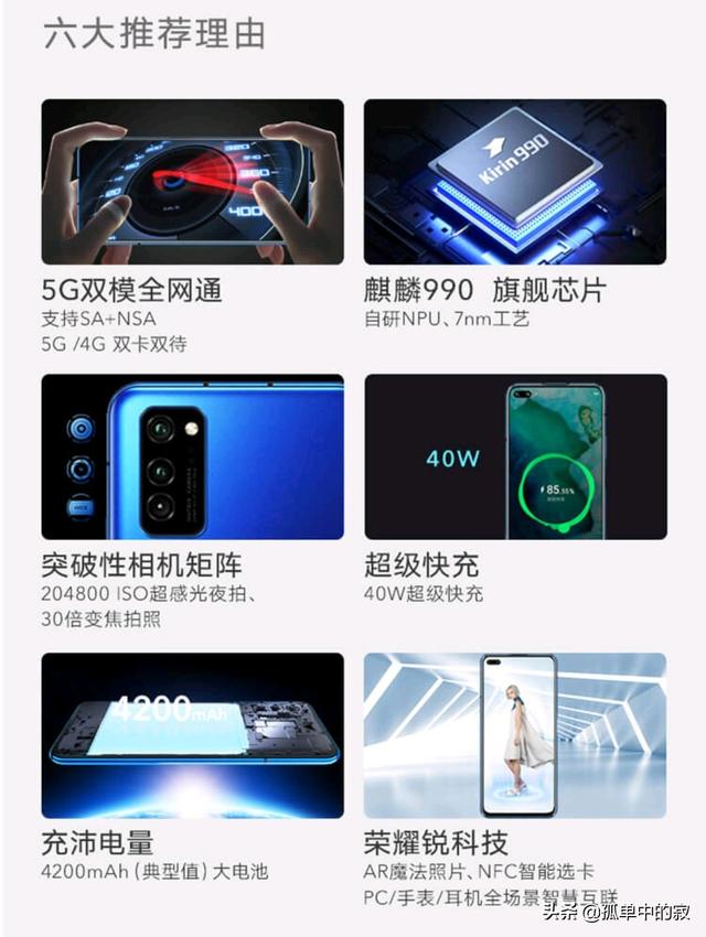 这款手机是去年12月份发布的。采用6.57英寸LCD双挖孔全面屏。9mm厚度以及200多g的重量。手感略微厚重。搭载麒麟990+巴龙5000 芯片。外挂式5G芯片。同样7nm制程工艺。性能相比麒麟820强了不少。安兔兔跑分大约47万左右。后置4000万像素三摄。主摄为IMX600。最高支持30倍数码变焦。以及ois光学防抖。拍照实力堪比旗舰。最高支持40w有线快充。不支持无线充电。拥有NFC功能。目前6+128版本大约2299元。8+128版本2499元。