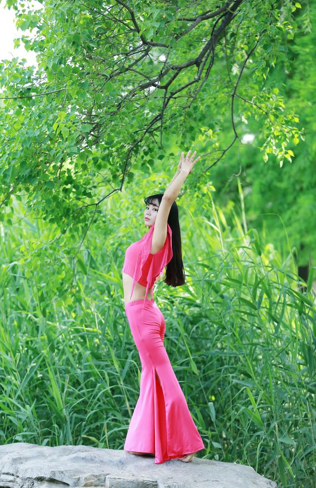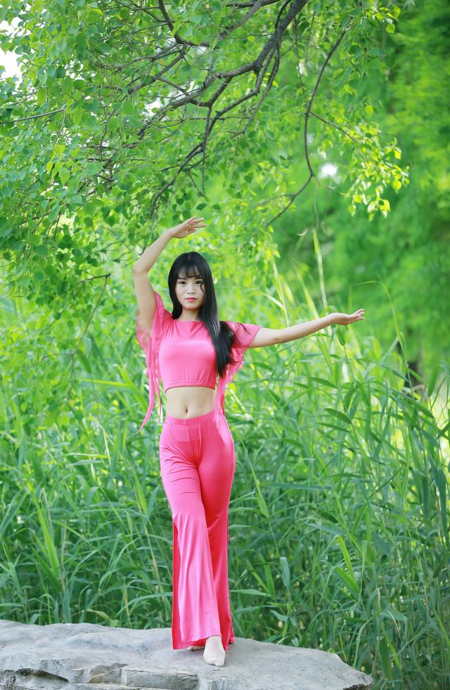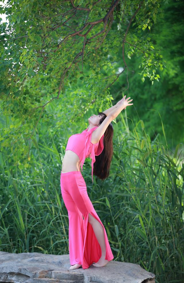 亲近大自然。练瑜伽同时呼吸新鲜好空气。拍摄出来效果也清新自然。绿葱葱背景。如果搭配粉色瑜伽服就更加好看了