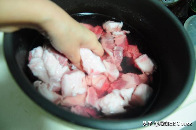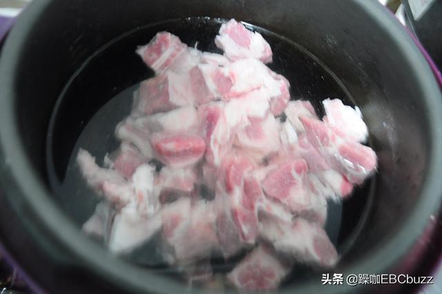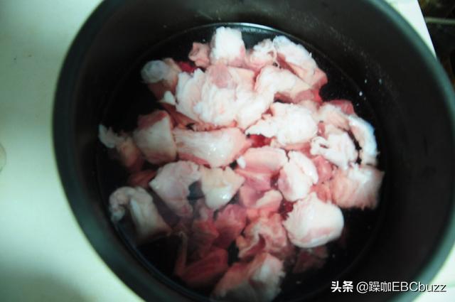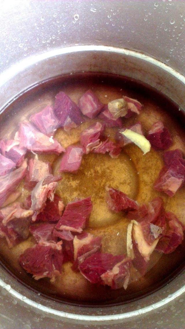 牛腩肉洗净切块放入高压锅中。放入姜片、料酒和清水。大火上汽后转小火2030分钟。
