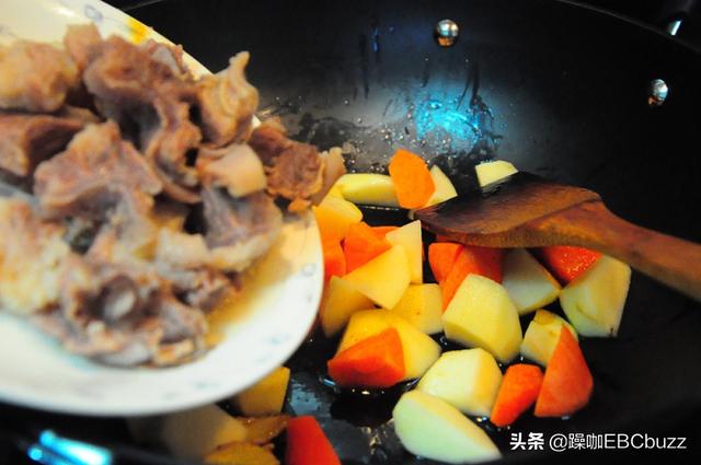 10.从高压锅里盛出来牛肉。放入锅内和胡萝卜。土豆。炒匀