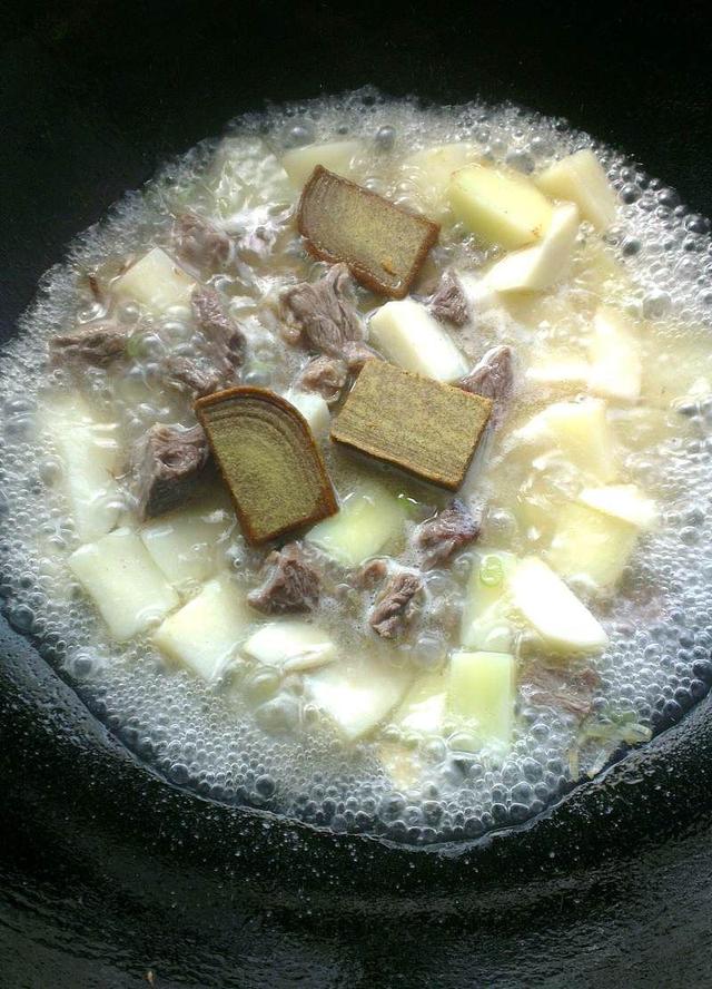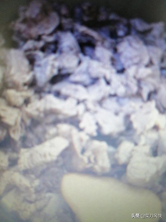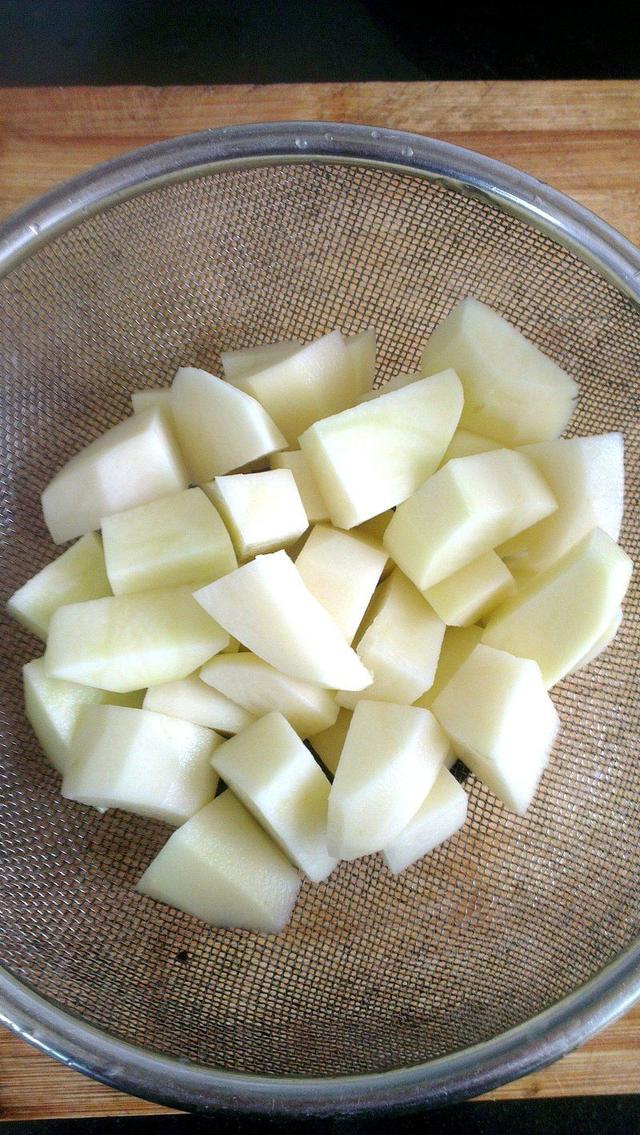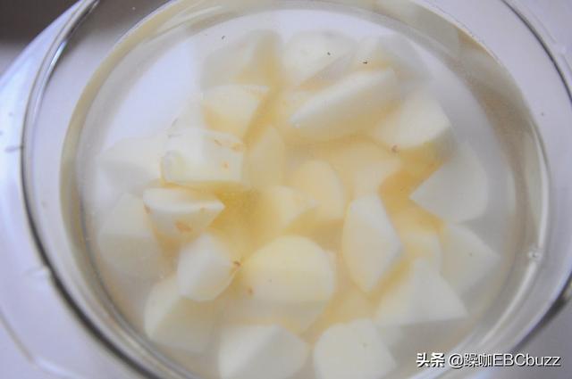 18.放入土豆。浸泡30分钟后(同时也能去除龙葵碱)。捞出。如果。大家凉拌土豆丝(丁)时。先用白水泡30分钟。在焯水时。放上一勺醋或腌制盐。土豆就非常完整了。还有。煮土豆块时。一定小火。因为。大火。土豆就会外皮爆裂。内心没熟。汤汁就会成糊糊