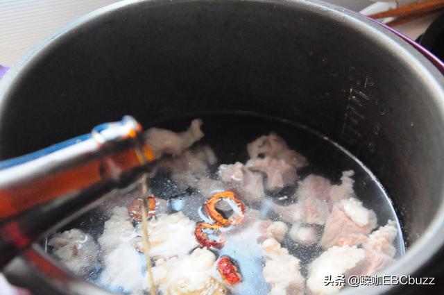 7.重新换上和牛肉同温度的水。放入牛肉。山楂。黄酒。盖上高压锅盖。35分钟后待用