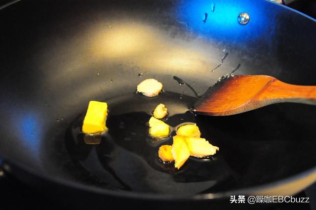 8.锅内放入少量底油。再放入姜和黄油。煸香