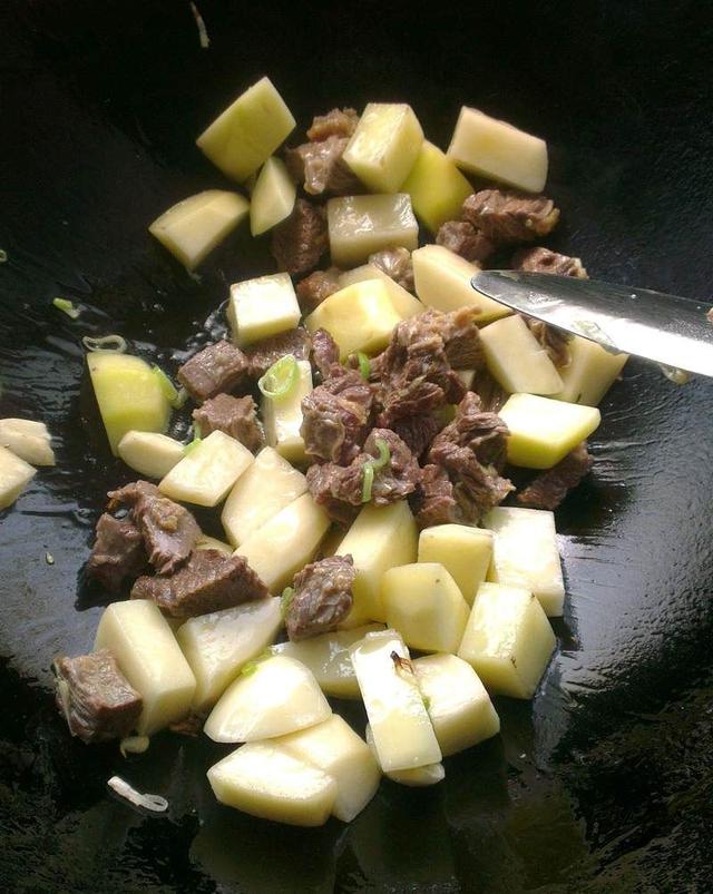 锅中油烧热。放葱姜蒜炒香。放土豆和牛肉翻炒片刻。