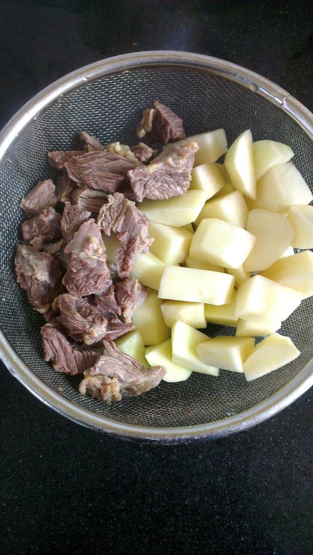 牛腩肉压好后自然散气。倒出来冲洗沥干。与土豆混合。