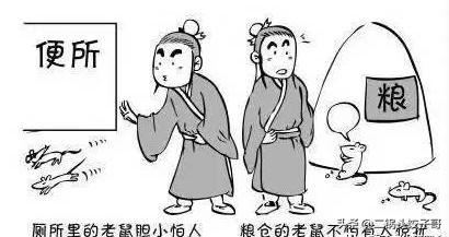话说。李斯出身卑微。没什么大关系。早年拜荀子为师。读圣贤、帝王书。平时在官府里当米仓管理员。有一天。他到厕所里蹲坑。也叫蹬坑。所谓蹬坑。就是找块木板子横跨在两边的粪坑上。人蹲在上面方便。但是古人这种粪坑都是很深的。一不小心也会掉下去。有一定的危险性。正是因为粪坑很深。所以大粪落坑的时间长、声音大、回音响。这就把下面偷粪吃的老鼠们吓得是经常抱头逃窜。慌慌张张。同时老鼠们还经常受到狗的侵扰。李斯看到这些骨瘦如柴、浑身恶臭、为食物担惊受怕的老鼠以后。觉得很有启发。因为看到自己管理的米仓里。也有很多老鼠。但那些老鼠却个个脑满肥肠。大腹便便的。不仅吃得好、住的好。还非常的神气活现。丝毫不怕人。