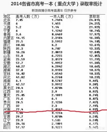 一本率不高。省内重点高校只有一所。河南考生的生存环境可谓十分恶劣。在这种条件下。想上好大学就更加难了。河南考生211录取率只有3.8%。与之对比的是上海北京天津三市12%以上的211高校录取率。怪不得会有“在河南上二本的分。在北京能上211”的说法。总的来说。河南是内部竞争激烈。内部资源严重缺乏。考生生存现状挤压的典型代表。