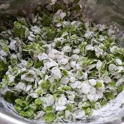 放入少量盐。继续搅拌。把每一个榆钱上面都裹上一层薄薄的面粉。注意面粉不要太厚。如果太厚。蒸出来的话就很多面疙瘩不好吃。