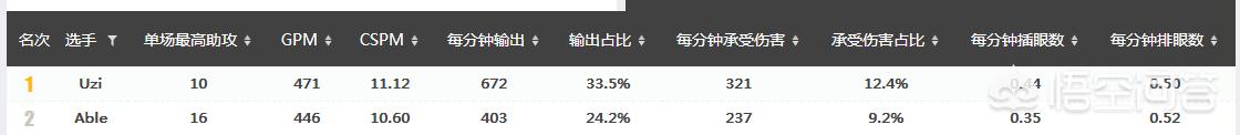 走A的助攻略高于UZI。证明更加偏向团队。UZI助攻不低的情况下还能打出更高的KDA、参团率、场均击杀、GPM、CSPM/每分钟输出和输出占比。更是高一个档次。UZI比走A承伤占比更大。但场均死亡是差不多。证明UZI是更能打出输出而更难死的AD