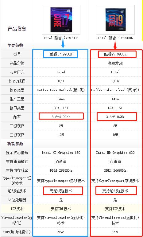只看参数的话。大家可能会发现。9700K与9900K的差别并不是很大。基本频率上。两款CPU相同。都为3.6GHz。在最高加速频率上。9700K的频率为4.9GHz。比9900K少了0.1GHz。在核心线程方面。两款CPU都是8个物理核心。但是9900K有超线程。线程方面是9700K的一倍。缓存方面也有一定差距。9700K为12MB。9900K为16MB。