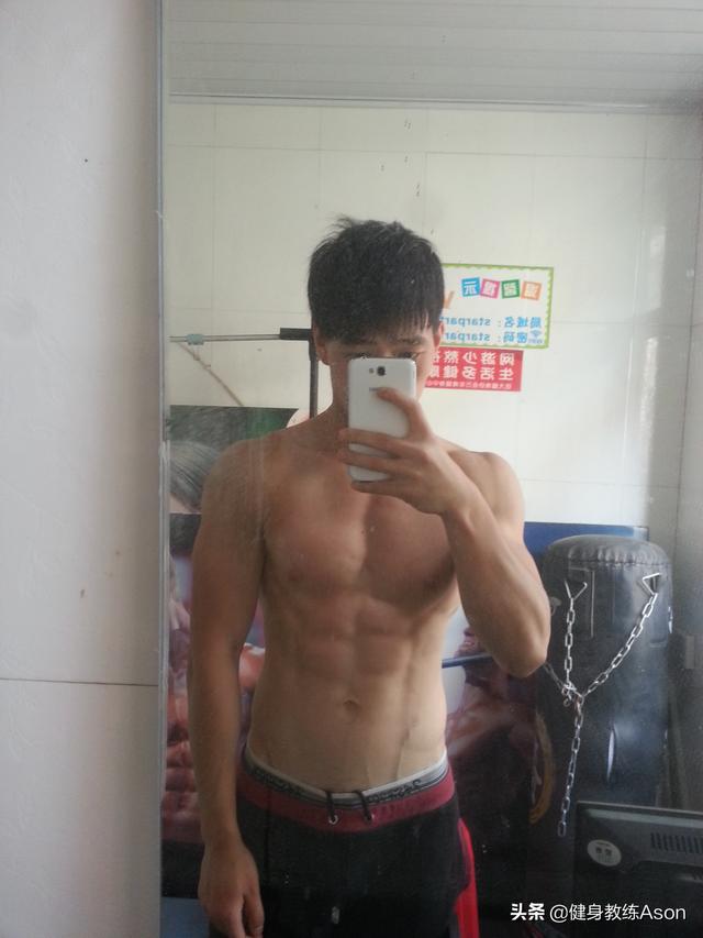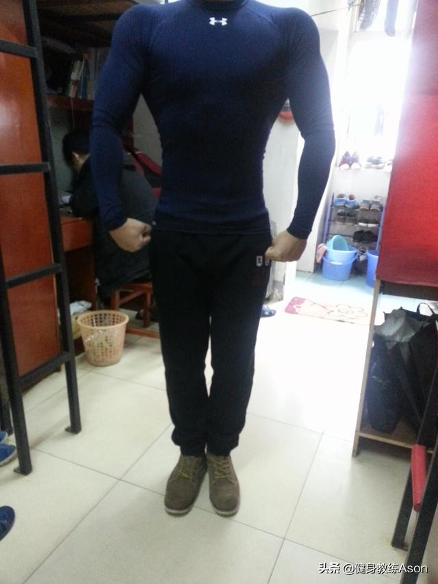 和大多数人一样。在刚开始健身时。只能自己在网上看看动作。自己摸索。各种各样杂乱的信息。今天看一种。学一下。下个星期看一种。练一下。反正现在想想当时的训练是非常不科学的。不仅动作不对(动作就完全跟着gif图做的)。计划也不合理。不过不管怎样好歹我也坚持下来了。中途没有放弃。因为在上学嘛。时间比较充裕。所以一周还是保证去健身房4-5次。半年后就是这样: