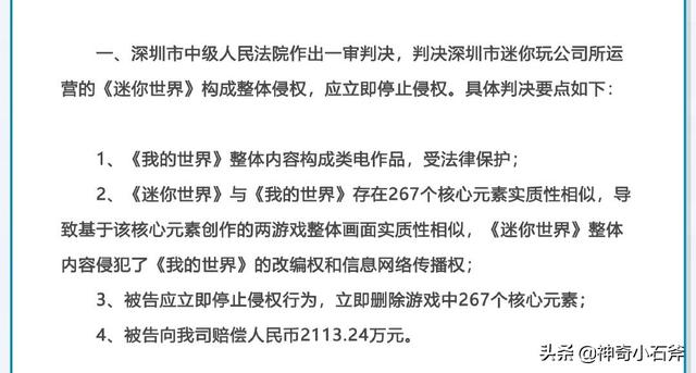据我的世界Minecraft官方在2020年12月31日发布的公告中。可以了解到。迷你世界抄袭了我的世界267个核心元素。