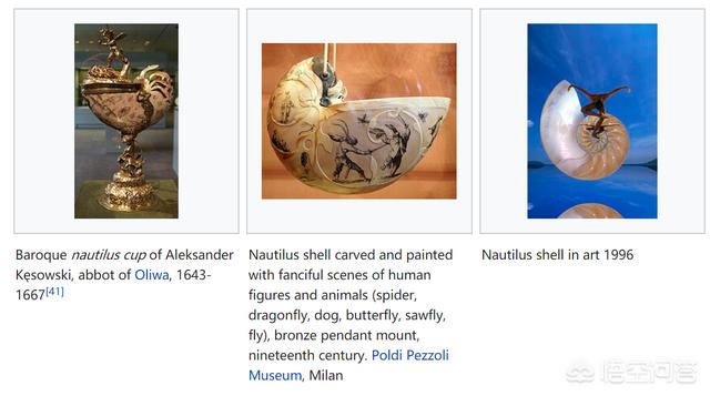 上图:被人类制作成精美工艺品的鹦鹉螺壳。