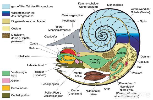 上图:鹦鹉螺的解剖结构。非常有特色的是其壳里面的气室(通常充满了氮气)。其中气体可经由中间的导管由鹦鹉螺自行控制来操控沉浮。