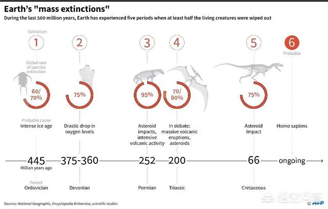 上图:地球上的5+1次大灭绝事件时间线和原因。