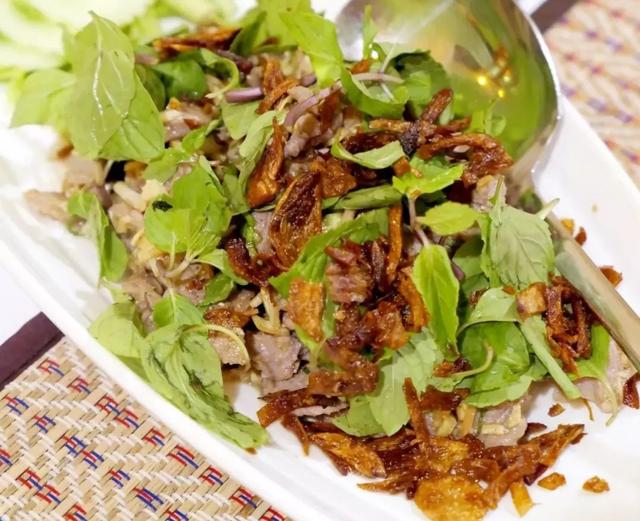 老挝最著名的菜是用剁碎的肉或鱼做成的沙拉。那里面还加入了柠檬草、辣椒、酸橙汁、吃起来又酸又辣。