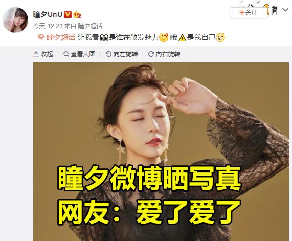 最近。瞳夕在微博上晒出3张写真照。并且配文道\"让我看看是谁在散发魅力?哦。是我自己!\"三张照片中。瞳夕都穿着黑色蕾丝裙。画着十分精致的妆容。眼角的点缀更是点睛之笔。不少粉丝纷纷点赞。表示\"啊!老婆好好看!你看我还有机会吗?\"